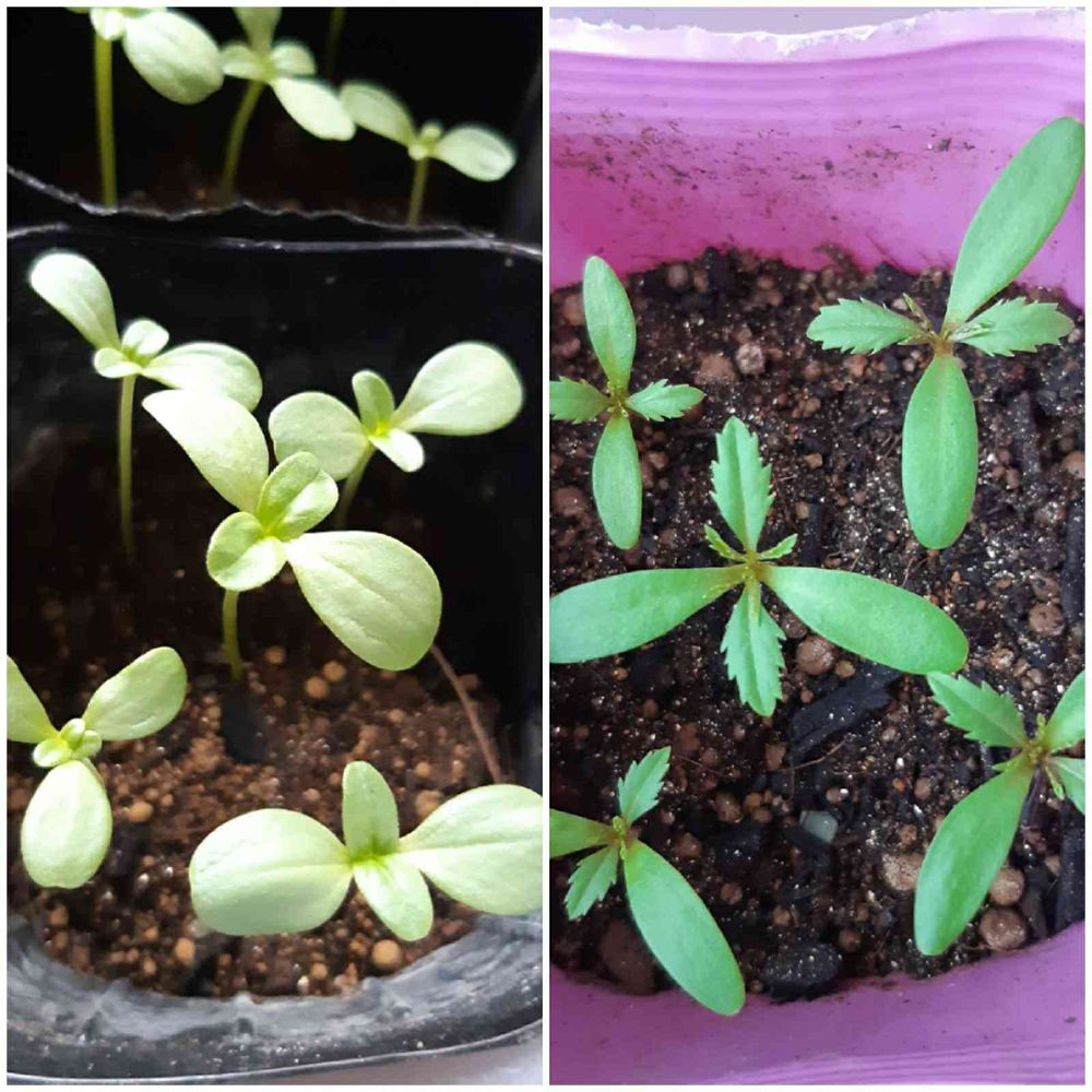 育苗中のジニア、クイーンライムと、アフリカンマリーゴールド(ホワイトバニラ)