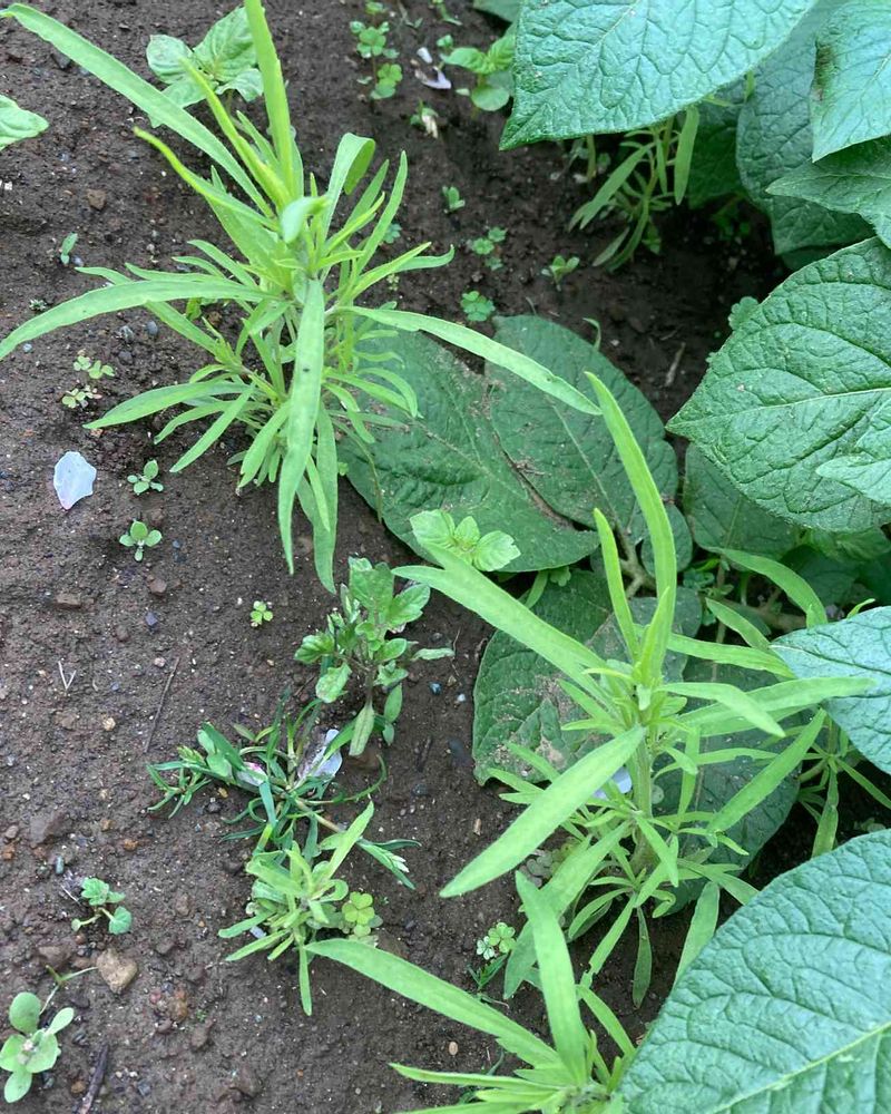 じゃがいもキタアカリの横にこぼれだねのコキアや大葉がでていた。別のところに移さないと。