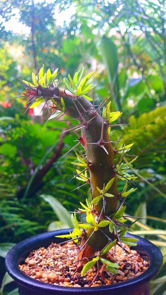 お迎えしたのは2020年の2月で、その頃はぐにゃっと横に伸びてた枝というかこの幹が横に伸びてただけなんですが、冬に先の部分は枯れてしまって、また新しい枝みたいなのがチョロっと出てきてます。ということで、日本の我が家の環境だと、ニョロニョロ育つには何十年かかかりそうです😝