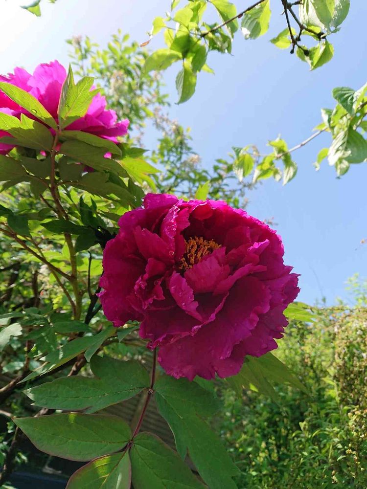 一株しかありませんが、大輪の牡丹が青空に映えてます😊