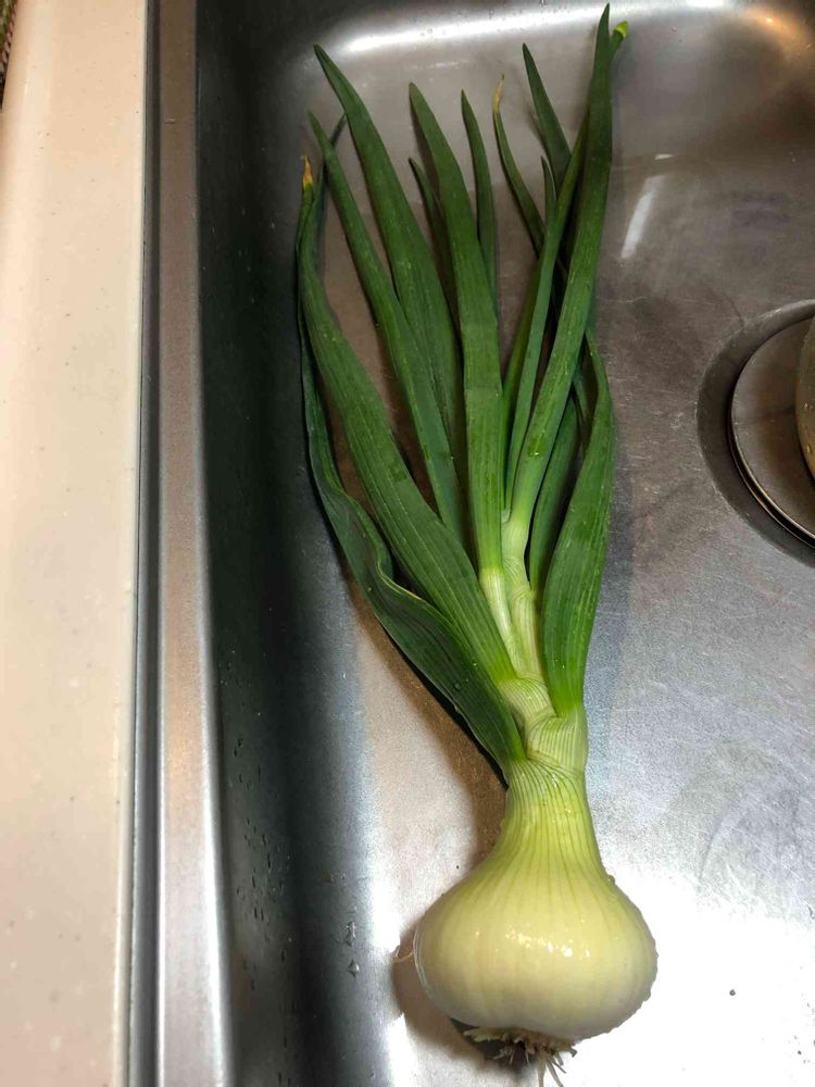 新玉ねぎ、葉が元気で捨てれなくて味噌汁入れたり、炒めたりして食べます。もちろん新玉ねぎはオニオンスライスしてサラダや豆腐に乗せて😚
