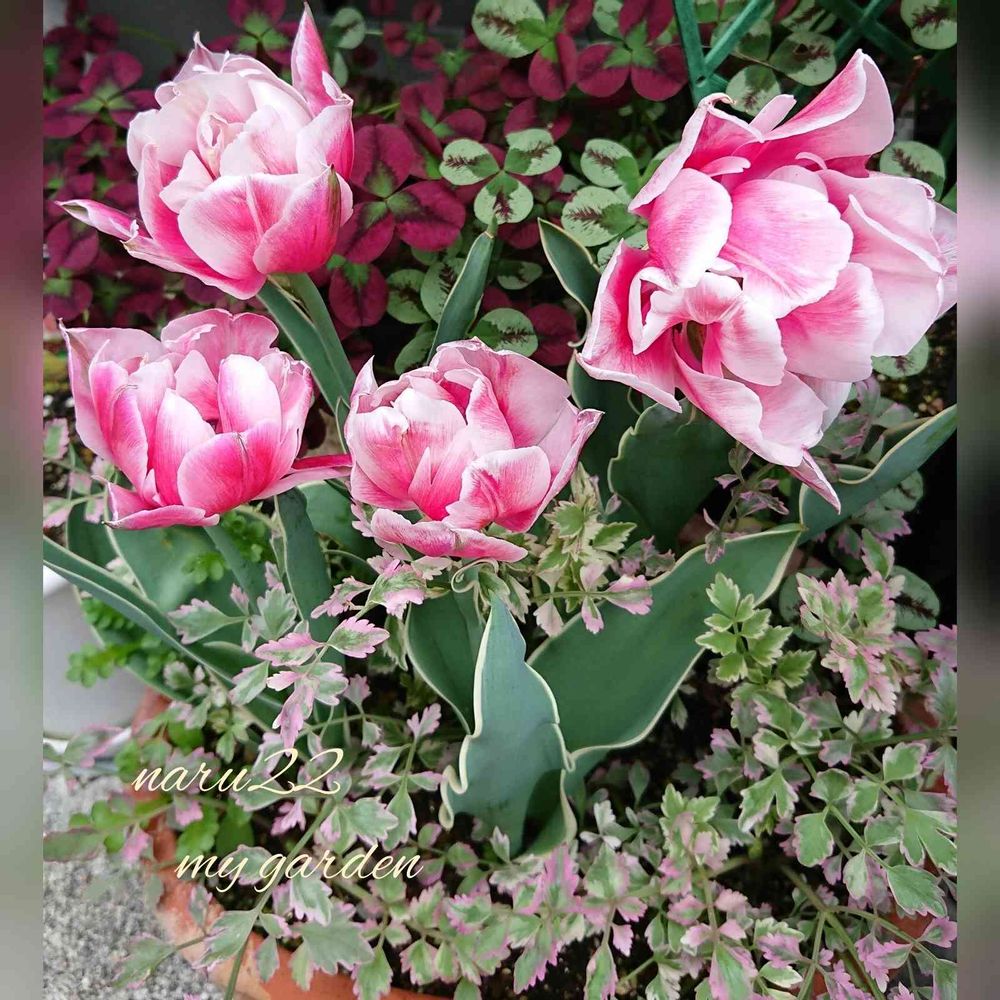 naru22さんの小さな庭,八重咲きチューリップ,斑入りセリ フラミンゴの投稿画像