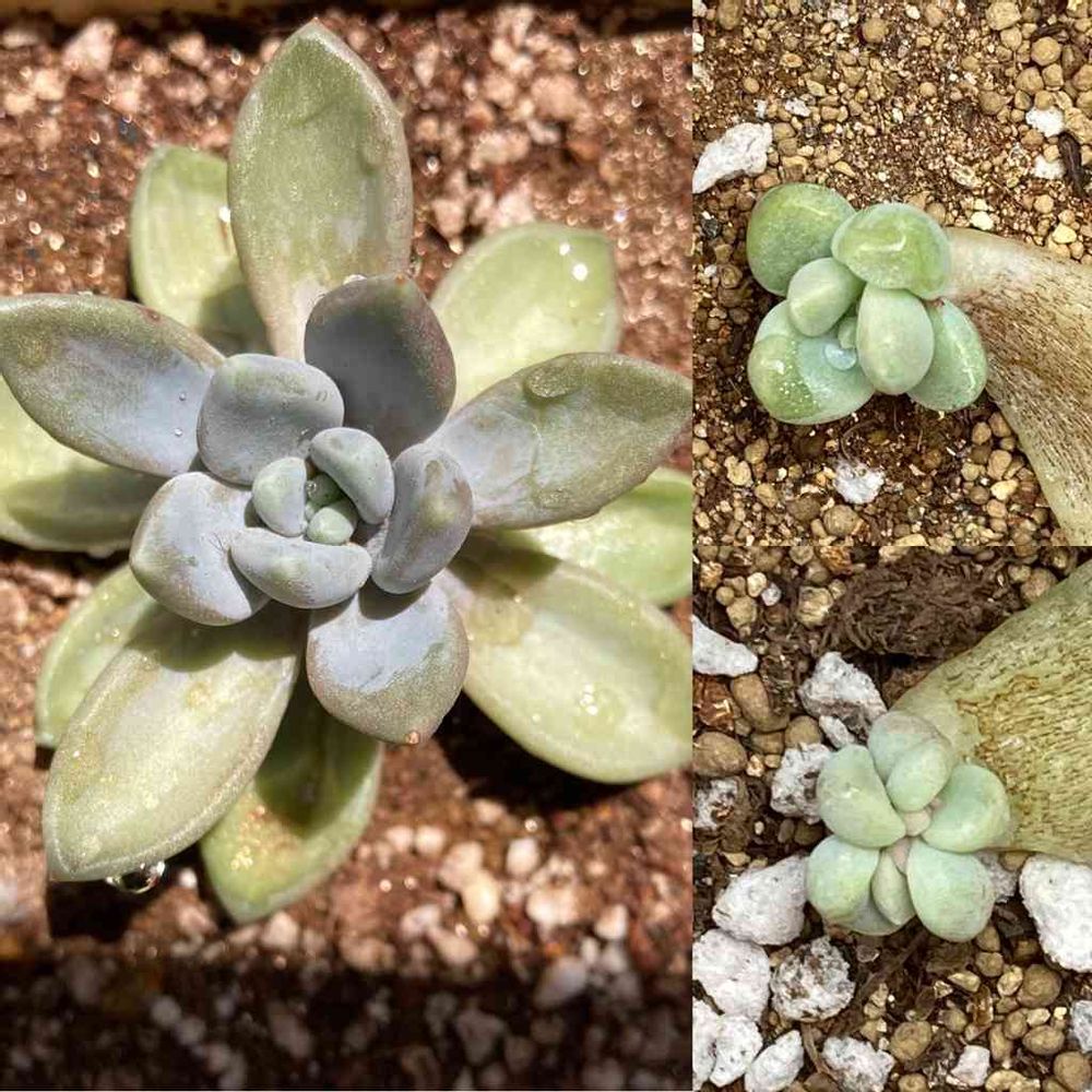 多重投稿して、すみませんでした。この多肉は、エケベリアの札がついていたのですが、粉がついてガッチリした葉っぱです。最初から大きめ。今は上に伸びている感じです。右は葉挿ししたもの。→自己解決しました。月花美人でした(多分)