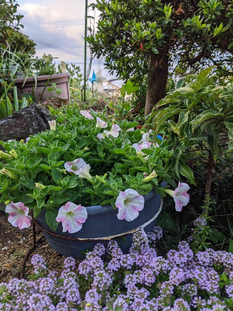 サファニアももいろハート。鉢に沿って、綺麗に花が咲いているのが、良いところ😱🤔🧐💘