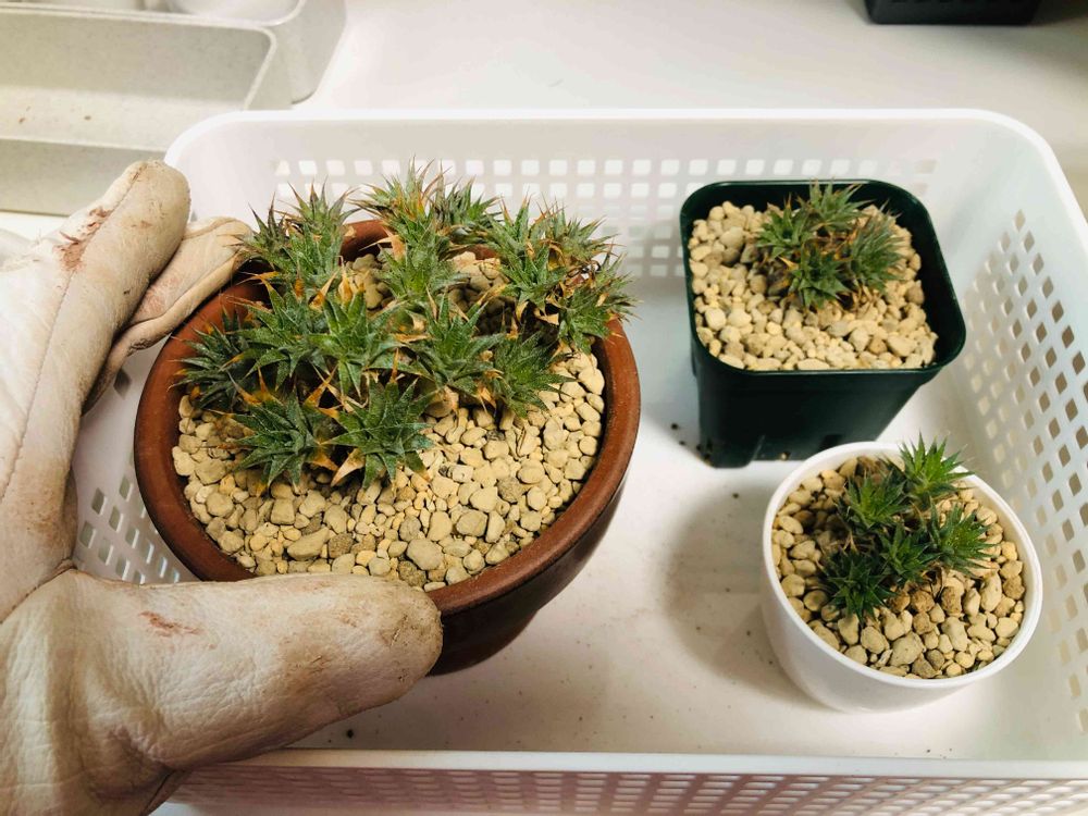 トゲトゲが痛くてしばらく植え替えをサボってましたが、本日は革手袋を付けて