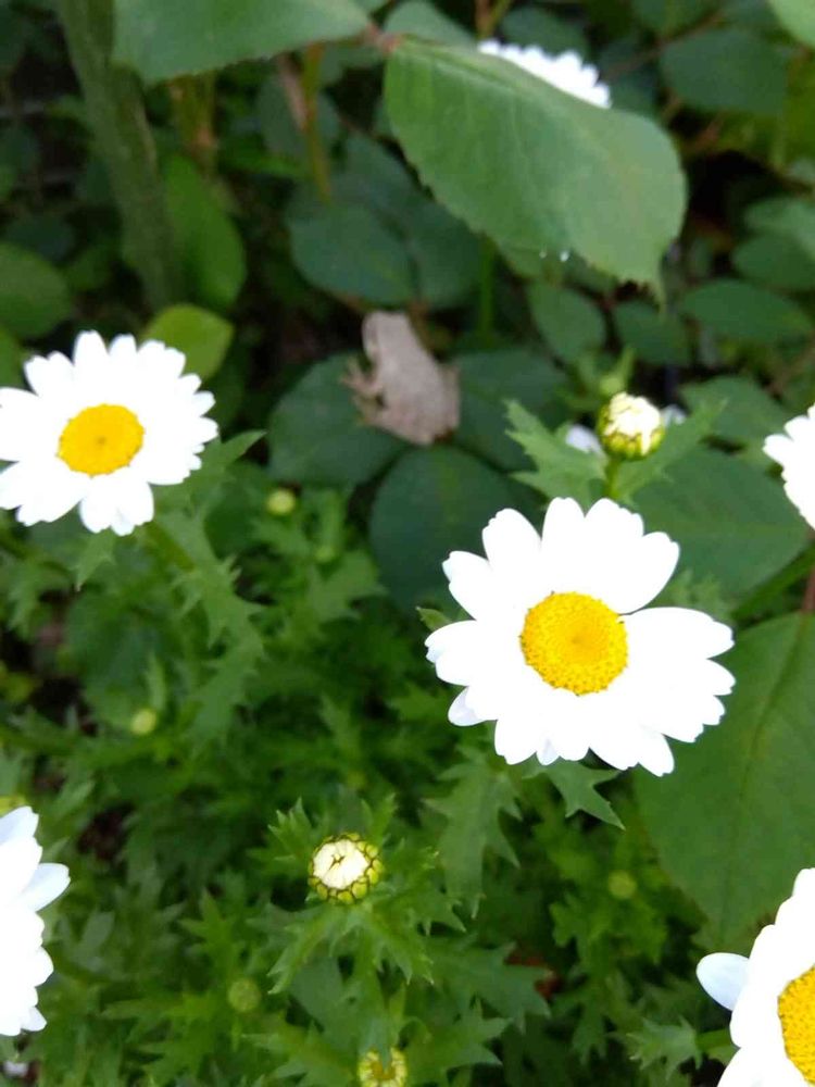 夕方の花壇〜ノースポールの向こうに薔薇の葉にかわいい💞🐸そおうとパチリ🤭