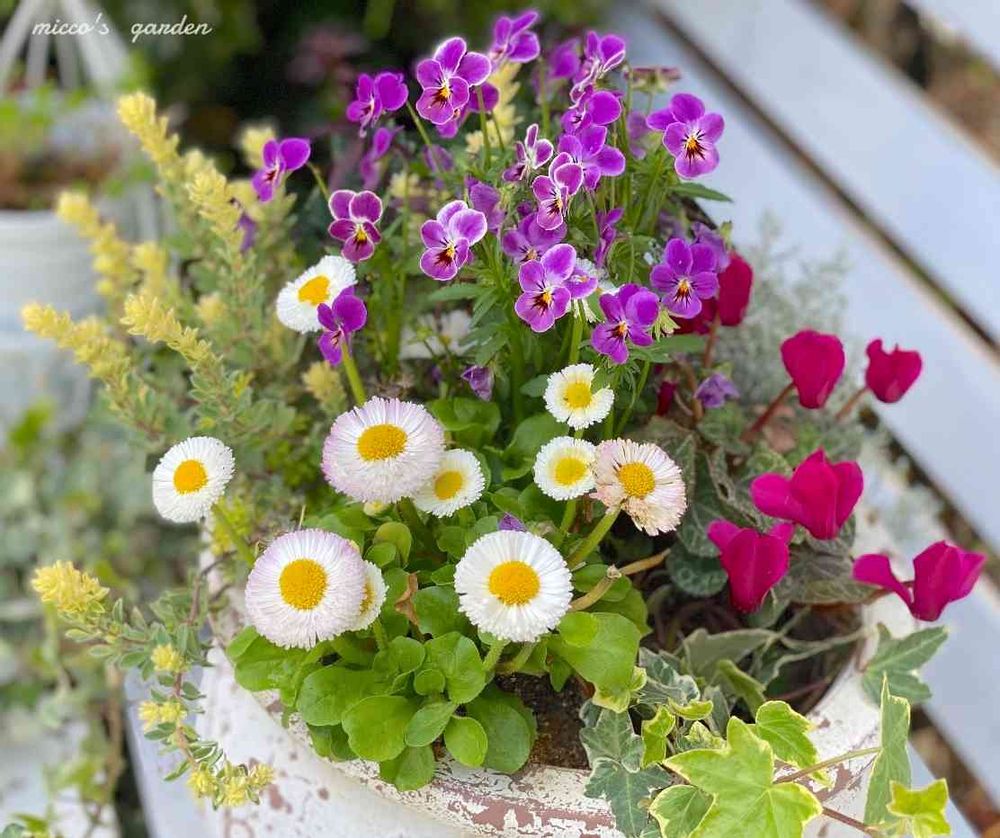 入れ替えたデージーも復活組もみんな綺麗で可愛い寄せ植えですね😃