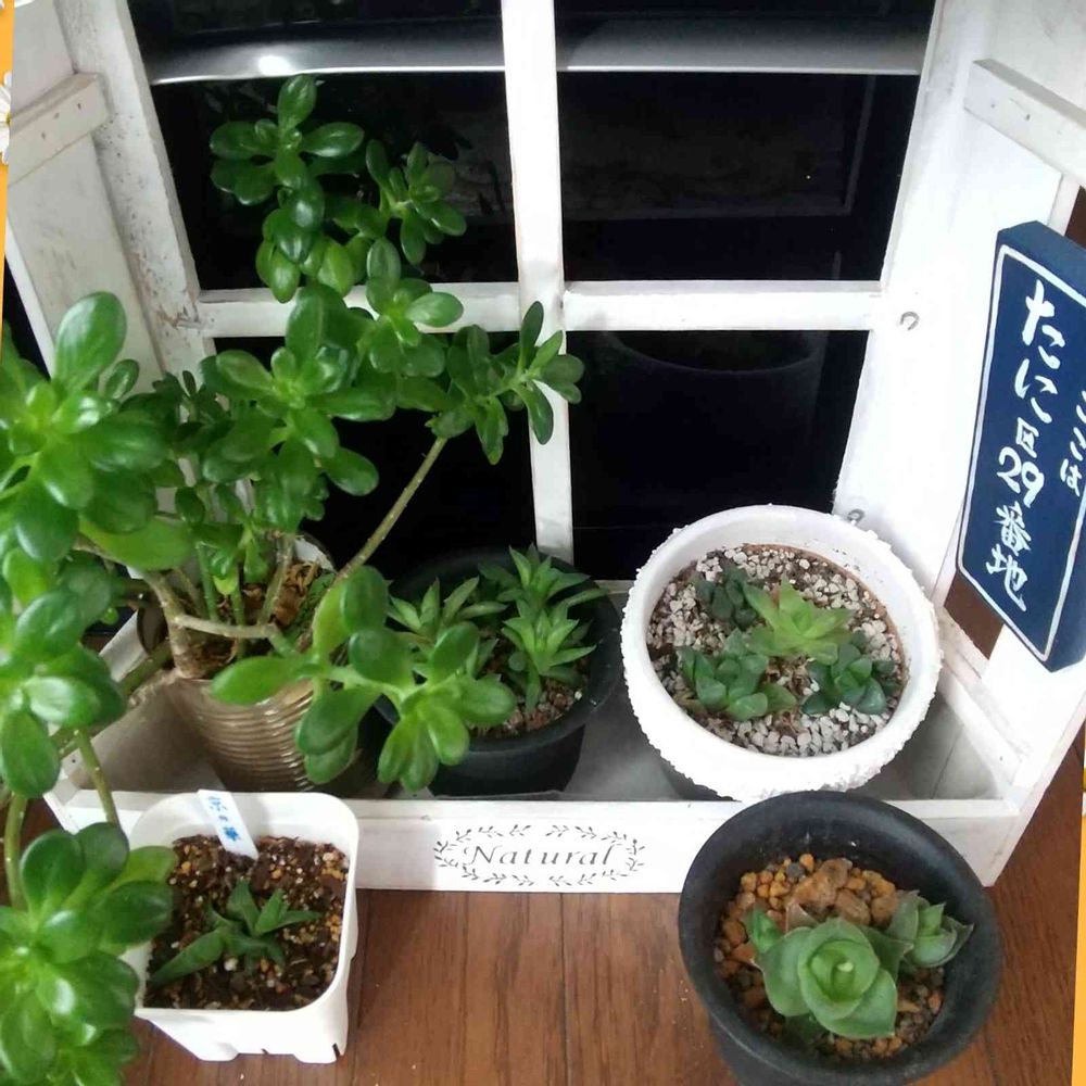 みなさまから繋がりのユーザーさんちから我が家へやってきたハオルチアとセダムばかりです。綺麗な緑💚に育ってきました。手前右のハオルチアにお初の花芽が😍