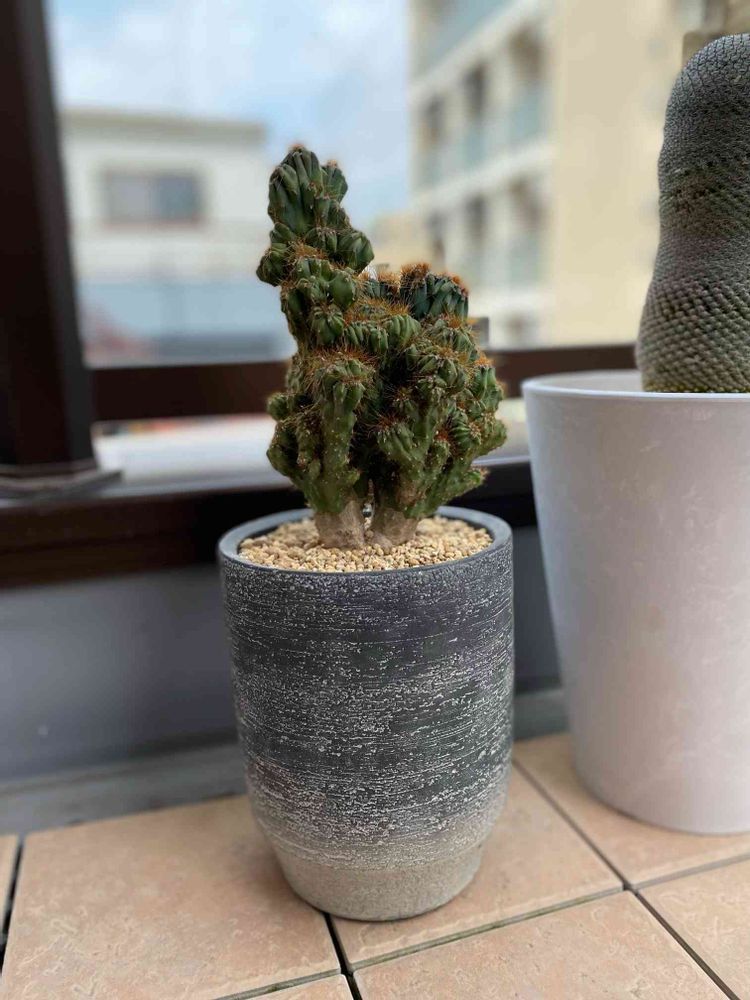 北向きサボテン。去年購入の金獅子(セレウス)。一年でみるみる大きくなり、高さ20cmに。雨にも雪にも耐えた剛健種。成長早いから大きめの鉢に植え替え。いびつでキモいが、好き。