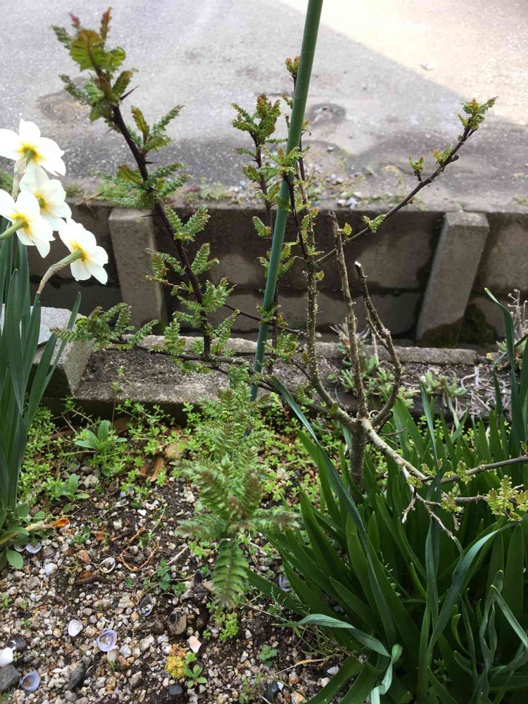 雨上がりの朝、裏口に、芽吹いてる山椒の🌿