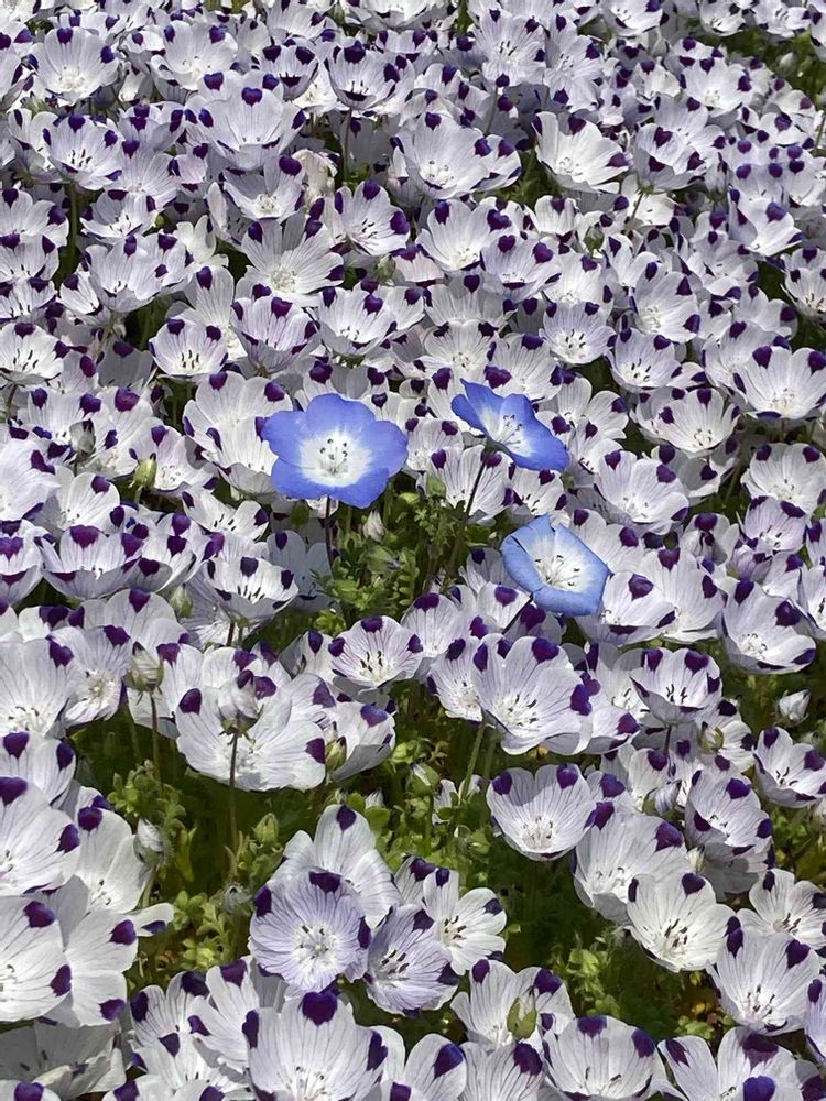 今は、ネモフィラは色々な所で咲かせていますよね。自分・過去に、ひたち海浜公園とか神奈川県のネモフィラしか見ていないので、大阪とか山口とかは写真だけの閲覧です。近頃は苗でも販売しているので嬉しいですよね。