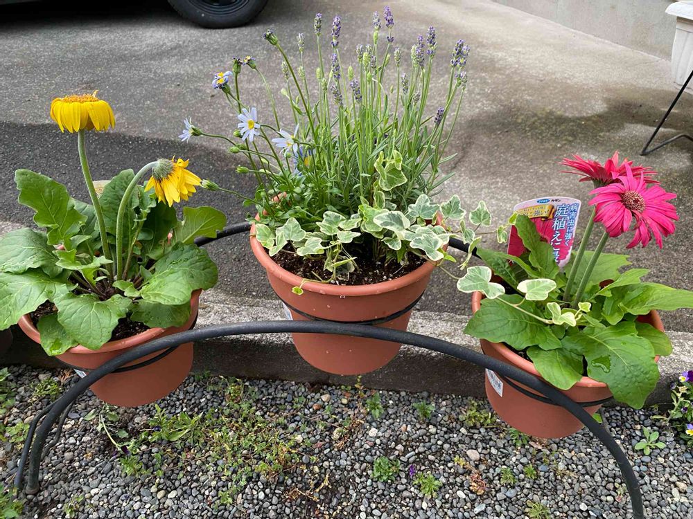 先日届いたガーベラを植え替え、寄せ植えした鉢と一緒に並べてみました。