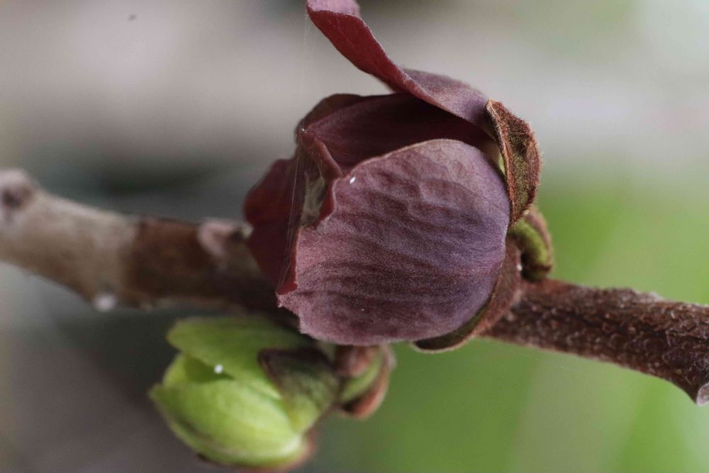 バンレイシ科の果樹で濃厚な香りと甘みがあるとのことですが、残念ながらまだ食べたことがありません。咲き始めは右のように緑色で、やがてチョコレート色になるようです。