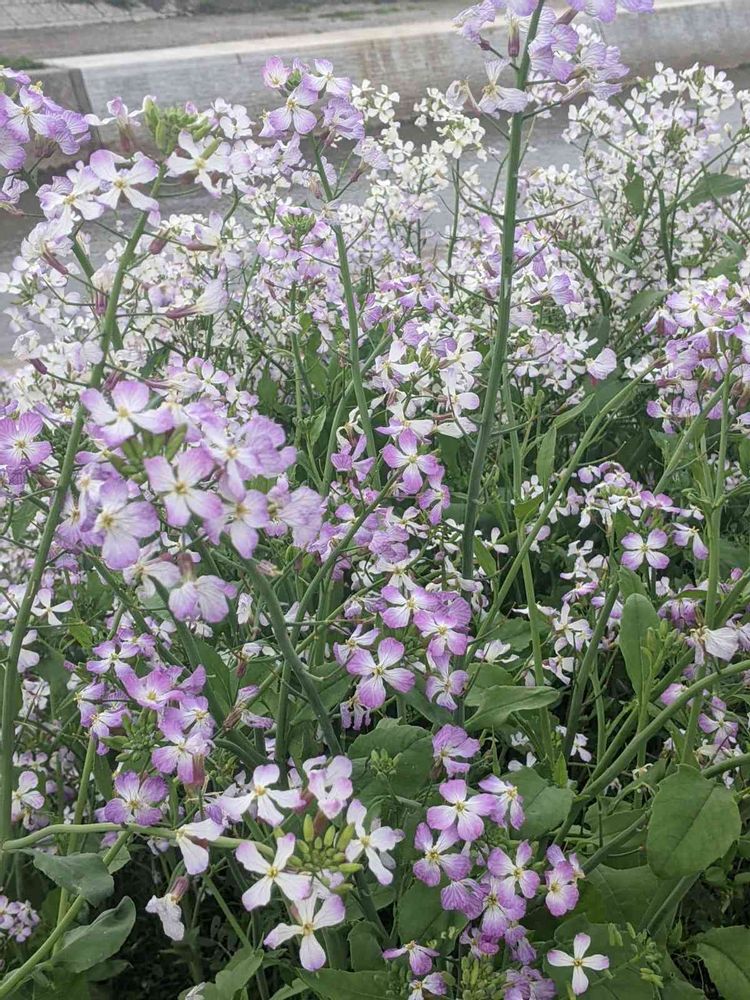 土手に大根のはなが綺麗に咲いていました👍💜🤍💚🧡