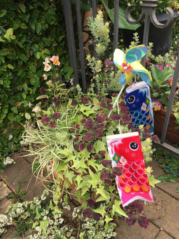 ビオラとクローバーの寄せ植え。ビオラの切り戻しをしてお花が少ないなぁと思っていたら2歳の息子が鯉のぼりを飾ってくれました!