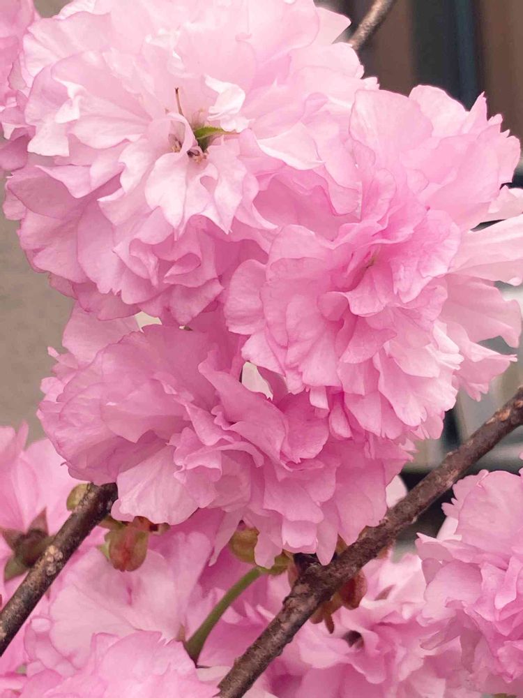 八重桜の枝をたくさんもらってきました。色鮮やかで華やか。玄関に飾りました。