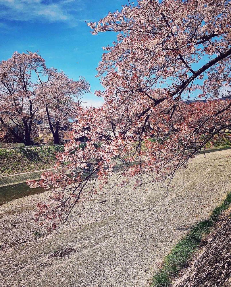 こちらも先週撮ったもの。既にだいぶ散っています。河原の窪んだところには、花びらが溜まって白くなっています😊