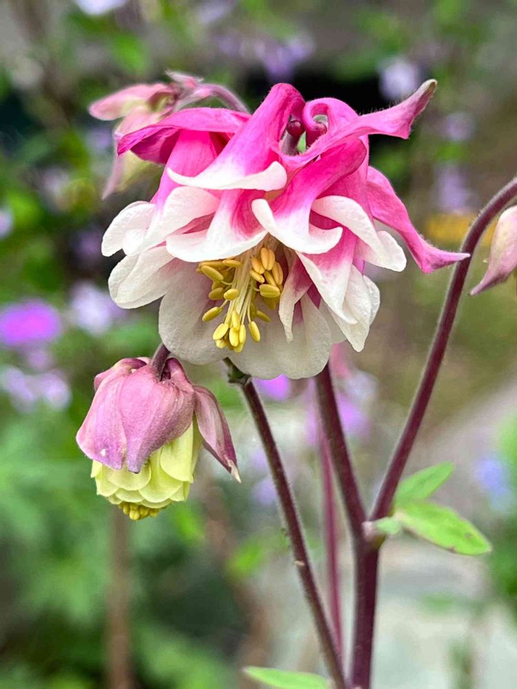 花径3cmほどのアキレギア・ピンクペチコートがピンク色の一重の花を花茎を伸ばしながら可憐に咲きました♪