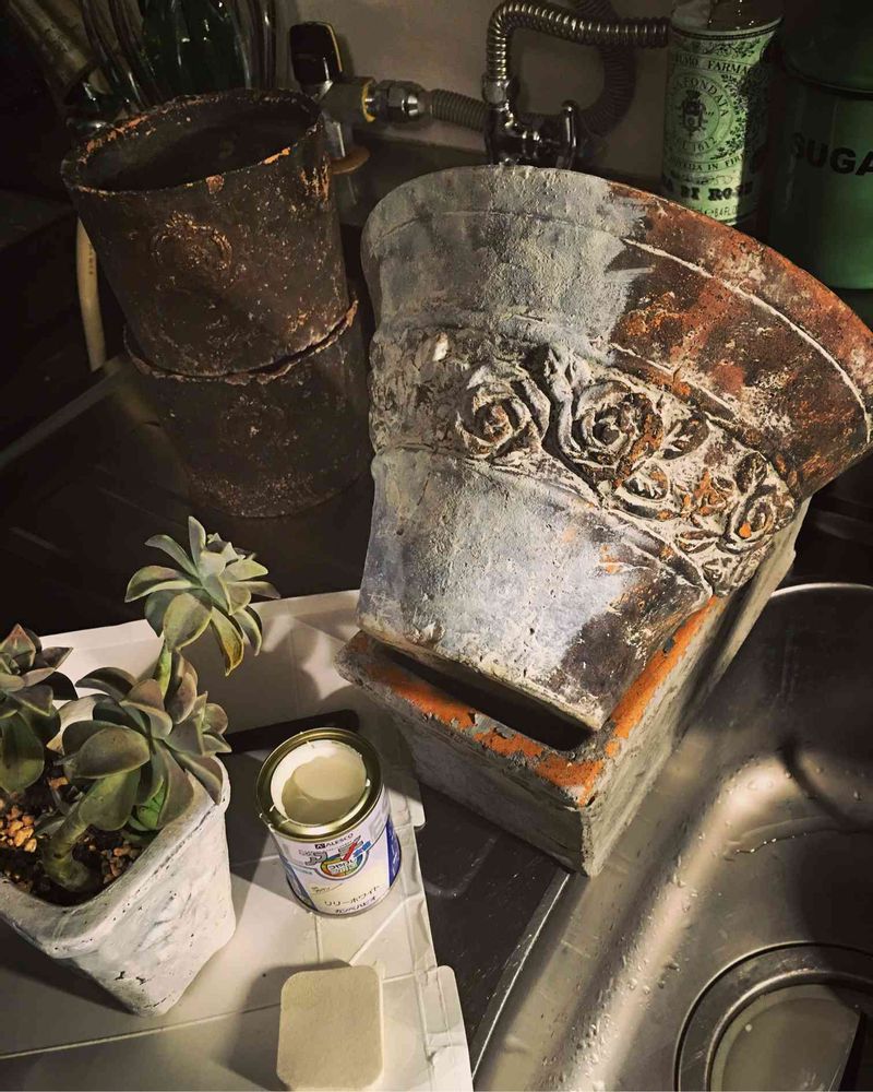 欠けたり色落ちした鉢をアンティーク風に修復。