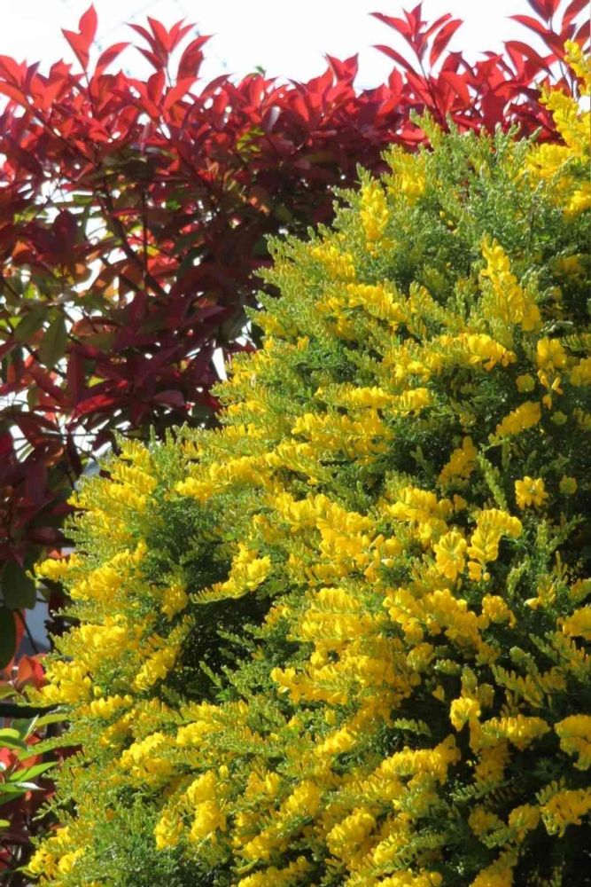 今年もエニシダが庭を黄色に染めて咲き始め、レッドロビンの赤い新葉と綺麗なコントラストを見せてくれています。