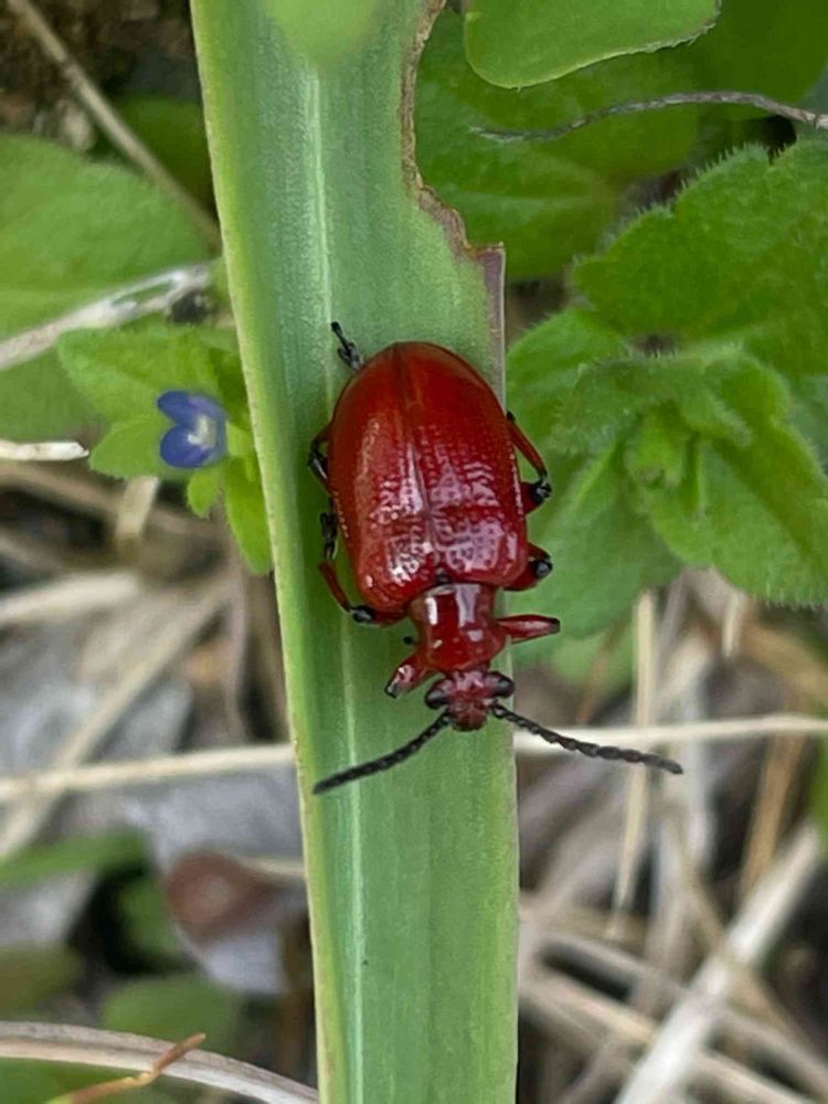 ユリクビナガハムシ❗️ユリの葉を食べてしまう害虫。やっと見つけました。
