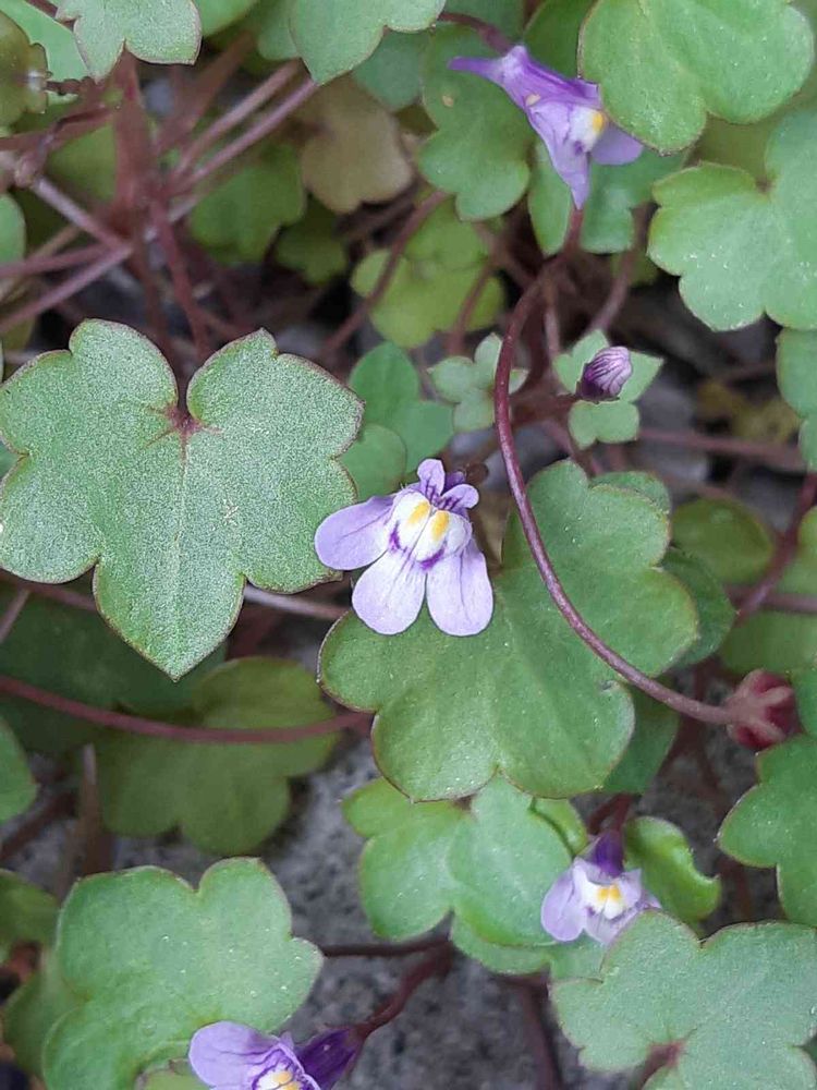 お隣との境界の砂利の上で咲いています。花も葉っぱの形も可愛いです💜