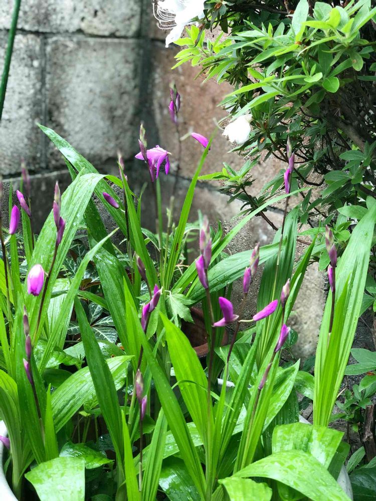 #紫蘭 #紫色の蕾 #ツツジ #白い花