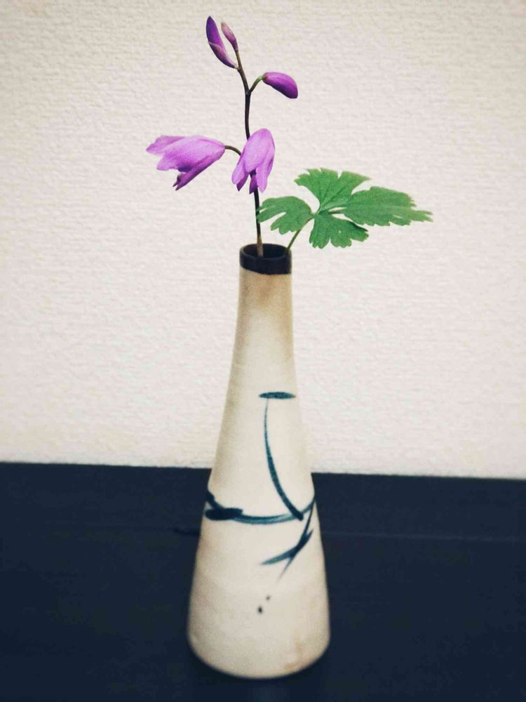野良で咲いてた紫蘭を連れ帰り、テキトーな葉を合わせて入れてみた