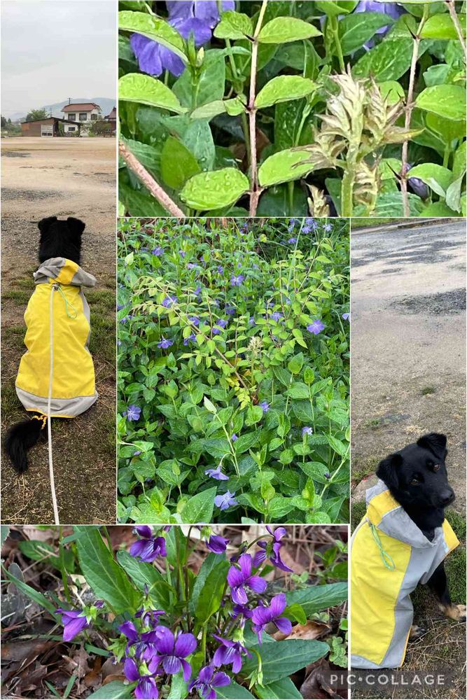今朝の朝散歩。背中に哀愁を漂わせるよしくん🐕🦺🟡 うちのタラの木はツルニチニチソウの中から、健気に芽を出しました。🔵沢山のお花を付けたスミレさん、なんて逞しいんでしょう。