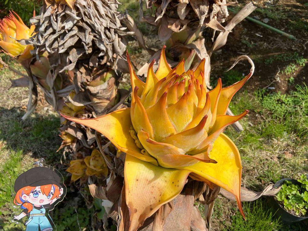 この子はチユウキンレンですね。漢字だと地湧金蓮と書きます。画像で見たことはあったのですが、実物は初めましてです。ハス🪷のような見た目ですが、バショウ科ムセラ属の植物で属は違いますが、バナナに違い仲間です。