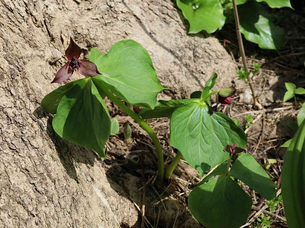 同じ株元からエンレイソウとコジマエンレイソウが生えているように見えます。