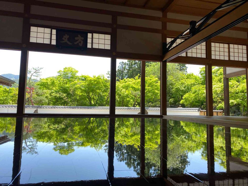 漆塗りされた床に もみじが写り
