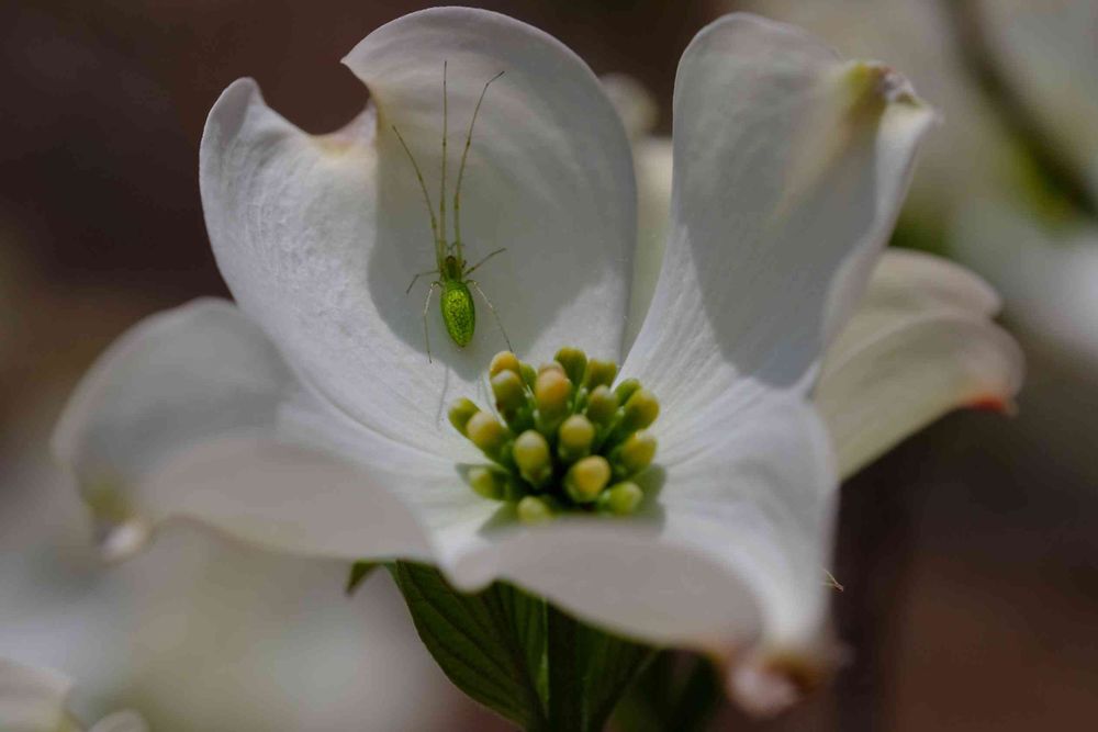 ハナミズキの蕊に擬態してるかのような蜘蛛はハナグモさんかなぁ〜💕