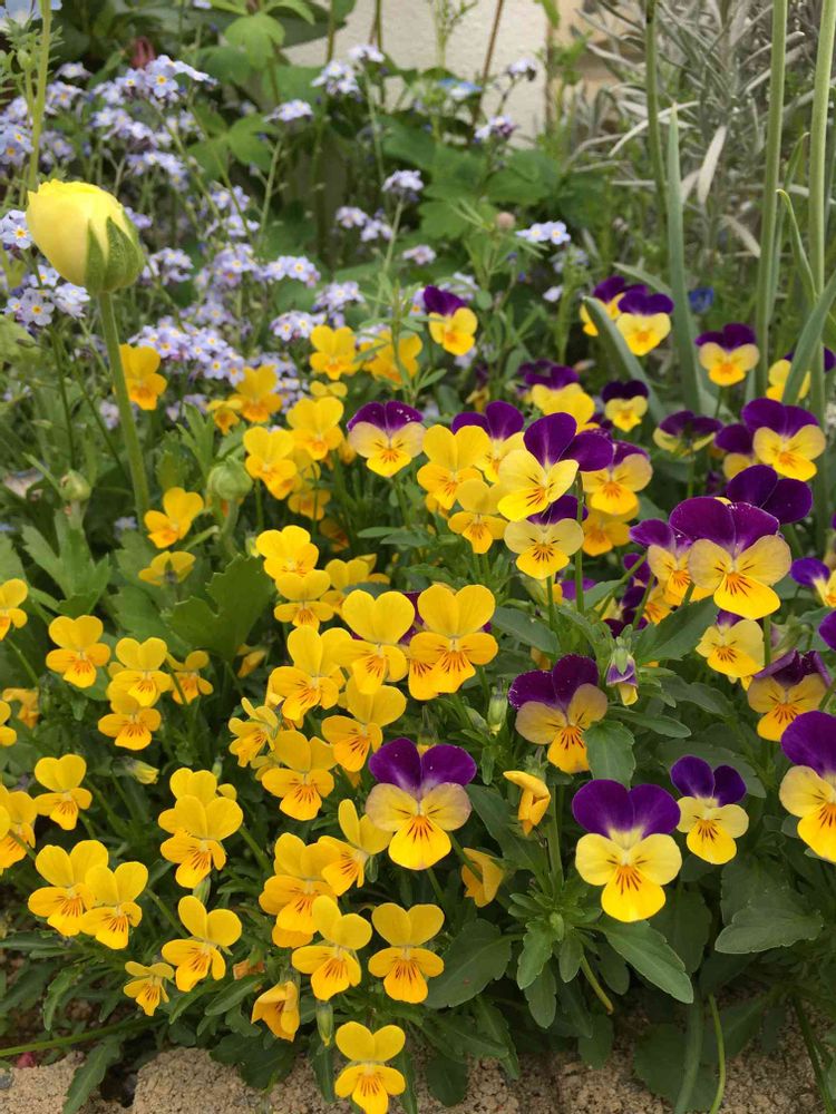 零れ種からの小さなビオラさんたちと、零れ種の忘れな草の小さな青い花がもう、かわいい!