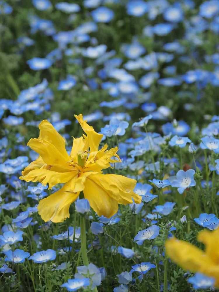 ネモフィラの中に、開きすぎた黄色の八重咲きチューリップ🌷