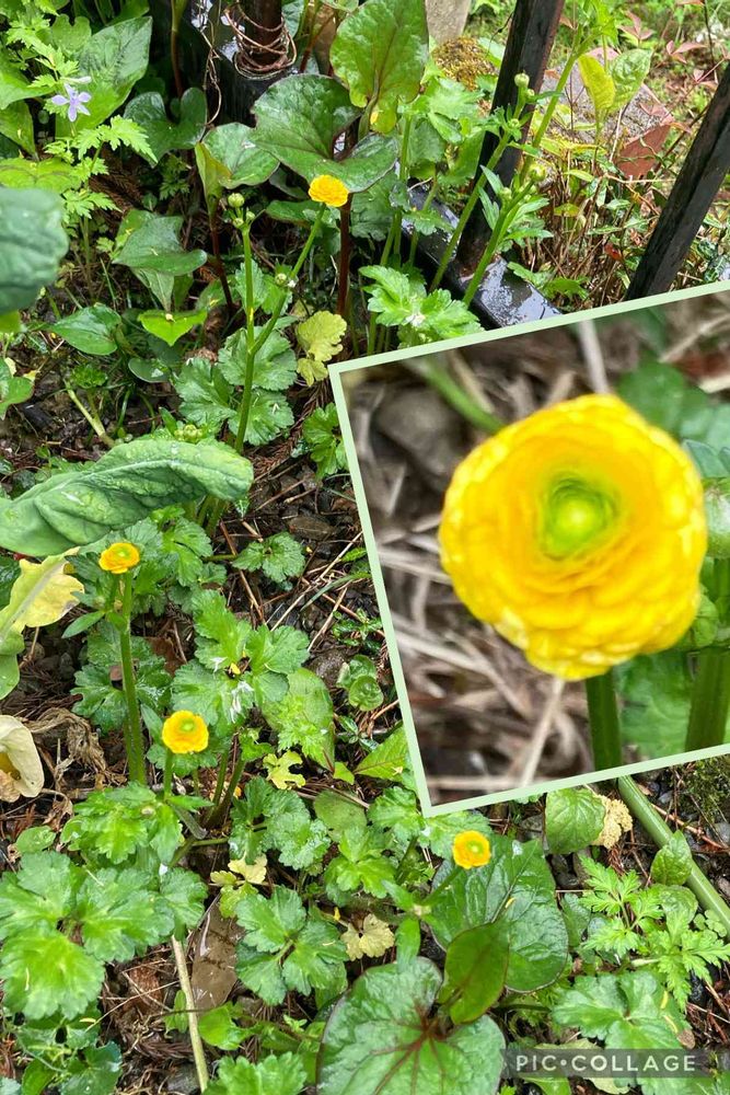 実家の、いつもなら紫花菜が出てくる場所に、初めて見る黄色いお花…近づいてみると小さなラナンキュラスみたいなお花😳‼️
