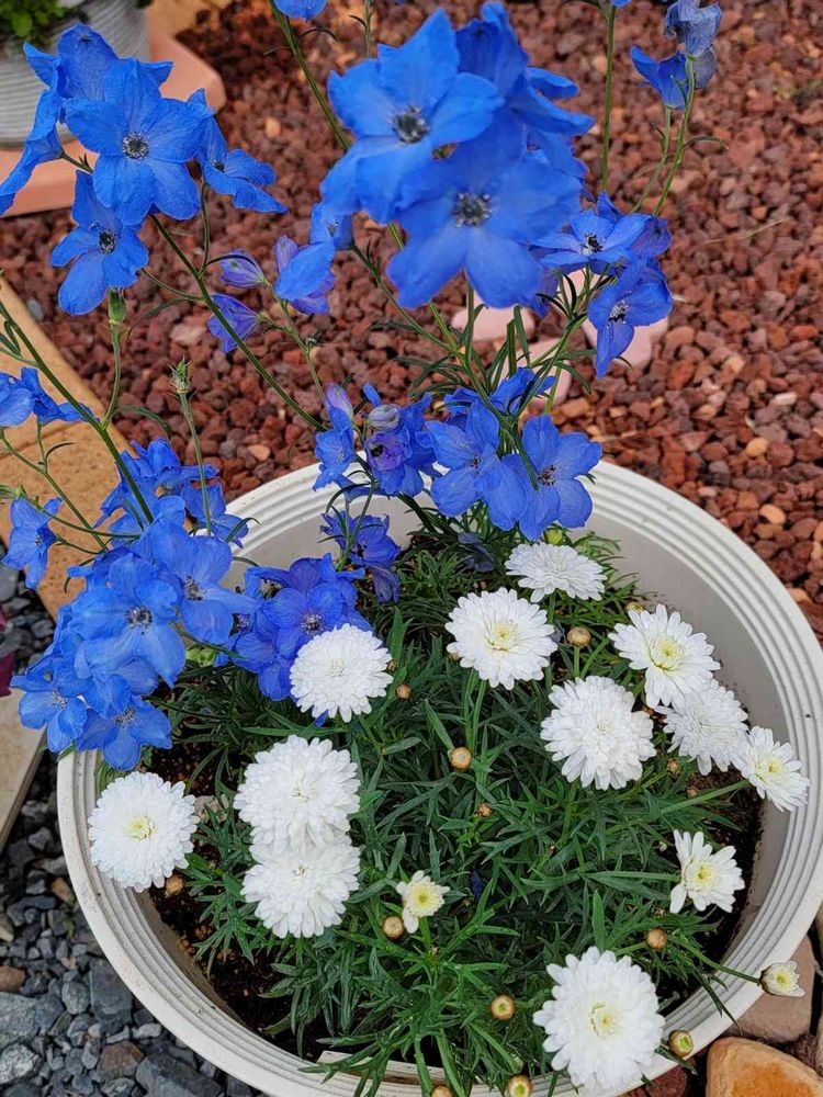 まっ🤍なマーガレットさんと💙のデルフィニウムさんの寄せ植え(◍˃ ᵕ ˂◍)♥