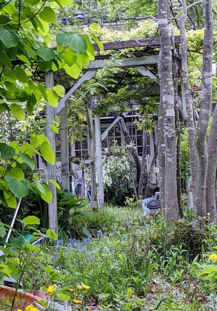 藤棚の下左側がビオトープ 今オタマジャクシが無数に育っています