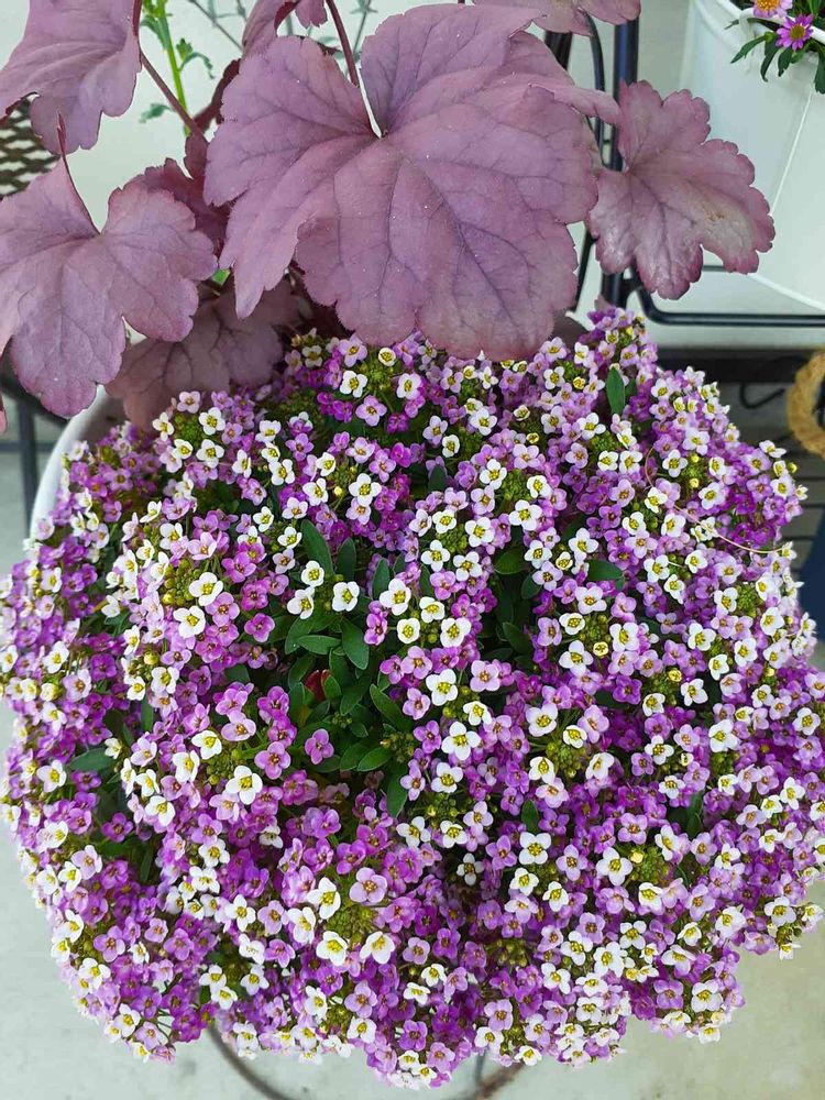 ヒューケラの色とアリッサムがいいかなと思って寄せ植えしましたが、アリッサムがもりもりに成りすぎました😅