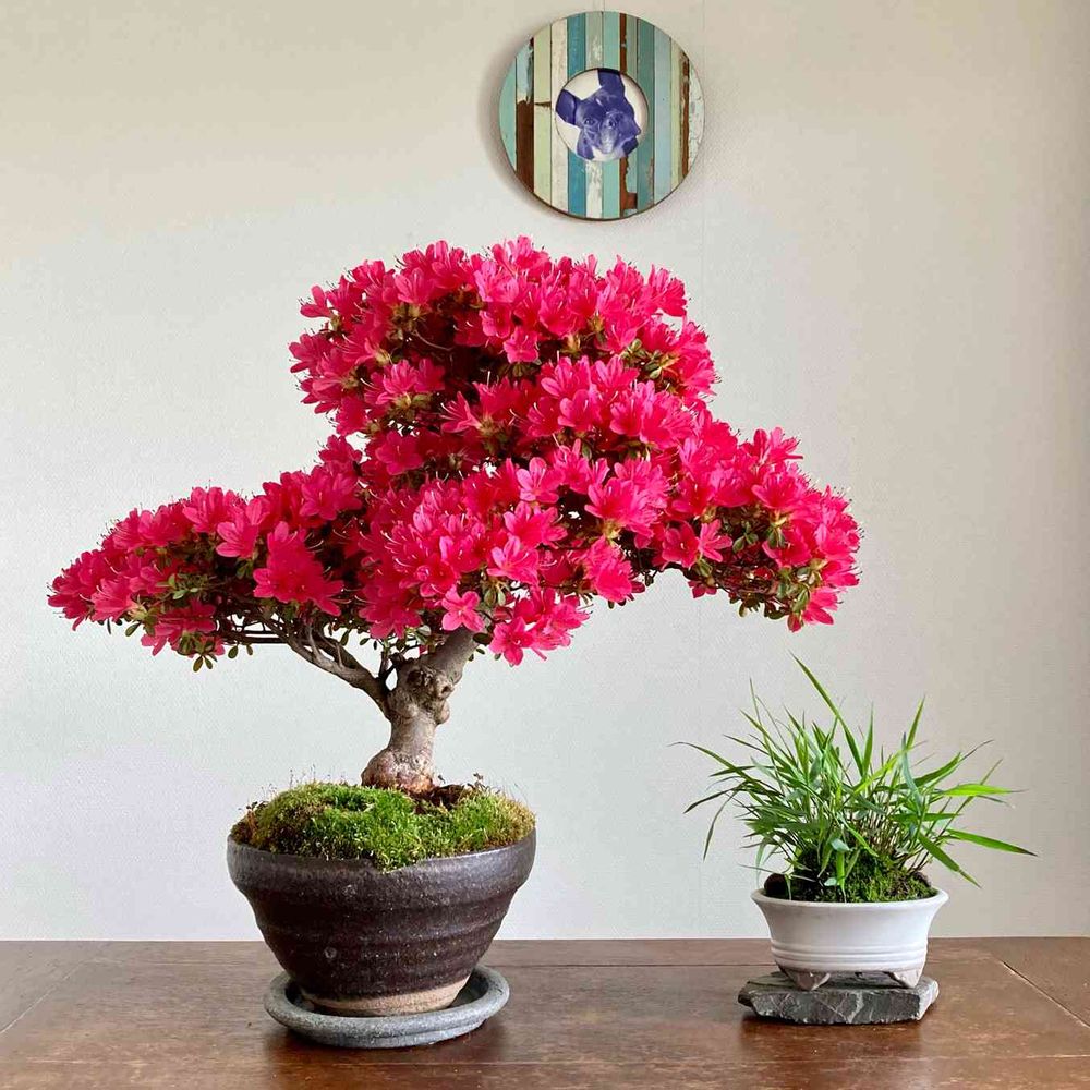 霧島ツツジが咲きました。樹高30cm。生垣に植えられていたものをもらってから6年目です。右は葉が伸びてきた風知草です。
