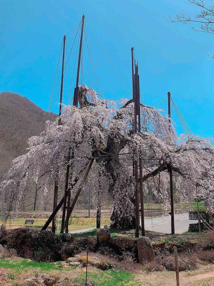 飛騨清見の大谷地区の西光寺境内にあり、樹齢800年以上と推定され、岐阜県の天然記念物に指定されています。枝垂れザクラとしては県下でも珍しい巨木です。