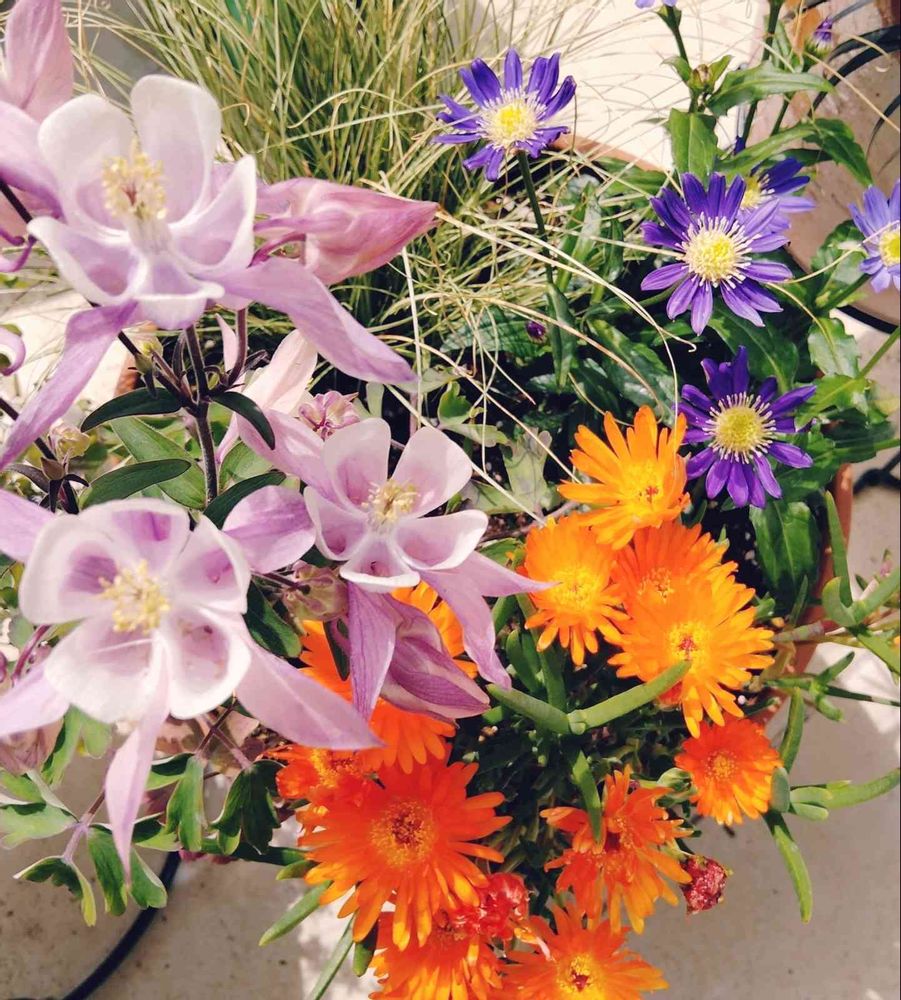 少し前に寄植えを植え替えました。オダマキとミヤコワスレ、マツバギクを一緒に。マツバギクのオレンジが元気をくれます💕