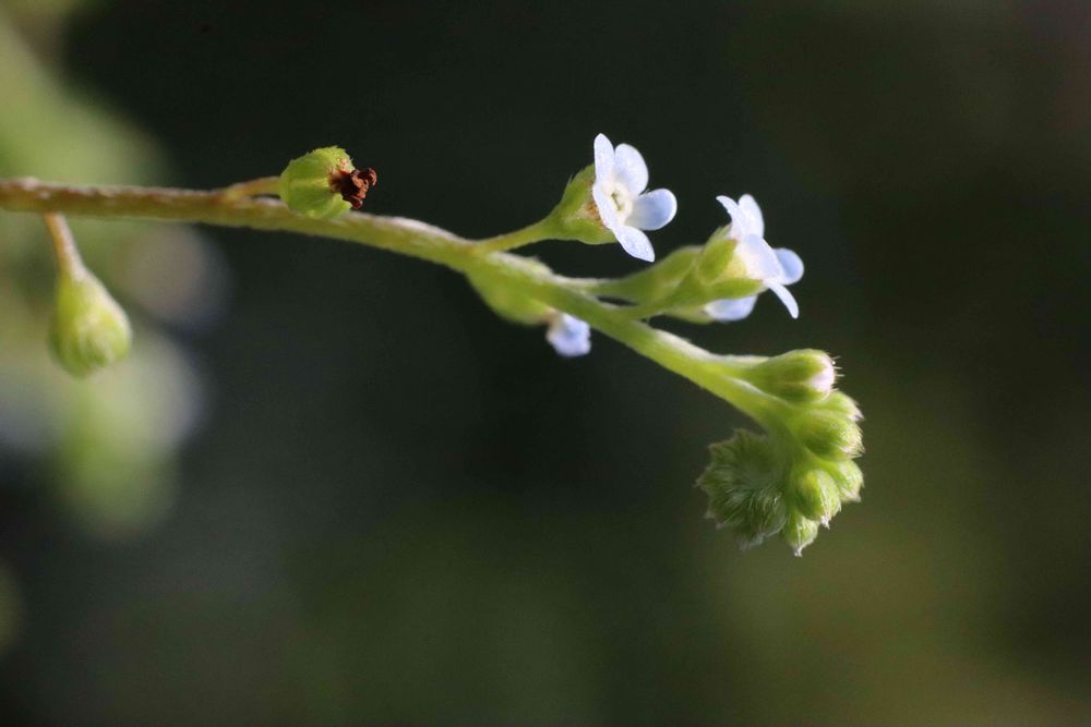 家の近くの公園でキュウリグサを見ました。茎の先にくるくると巻いた蕾が並び、咲くにつれてまっすぐに伸びていきます。花は2ミリ位でとても小さい。葉をもむとキュウリのようなにおいがすることが名前の由来とのことなので、試してみたら確かにキュウリのような匂いでした。