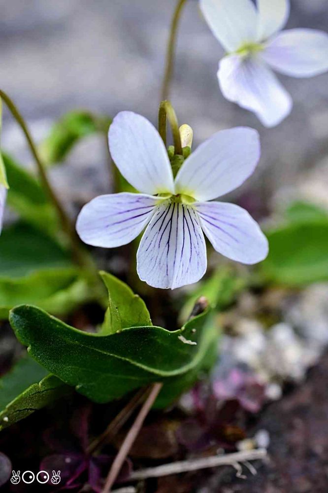 花は 野の「スミレ」の花弁の紫色が抜けて 花色が白くなり、紫のスジだけが残ったもので、葉の形などの特徴は「スミレ」と全く一緒です。