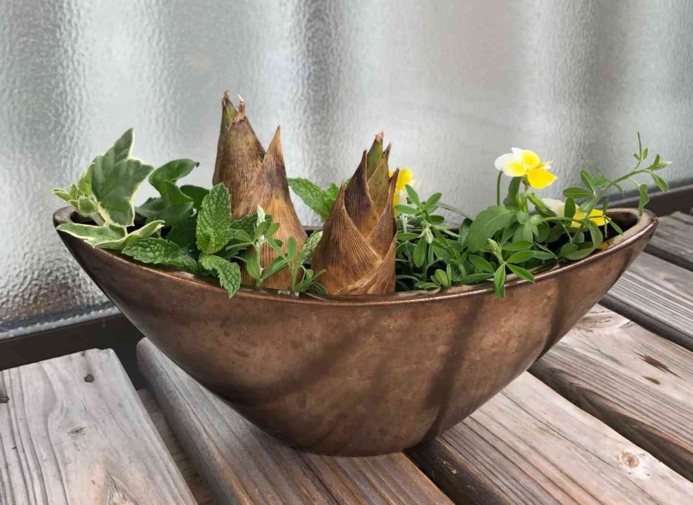 緑のバランスと土色な器がすてきだからですね🍃✨ このタケノコなら〜私の飯盒生けに合いそうでした🤣