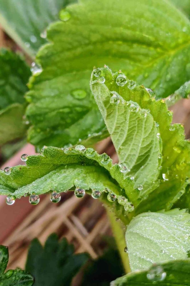 いちごの葉に水滴、露玉。