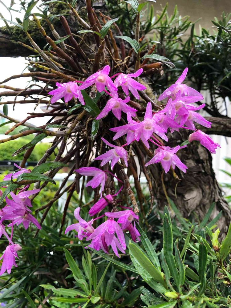 昨年友達に鉢で貰ったセッコクを水苔で巻いてまきの木に付けてみたら花咲きました🌸