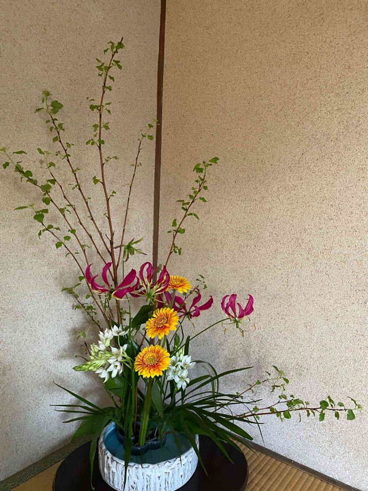 グロリオサは初めての花材で、葉っぱの蔓がすぐ絡むので引き離すのに難儀しました😅
