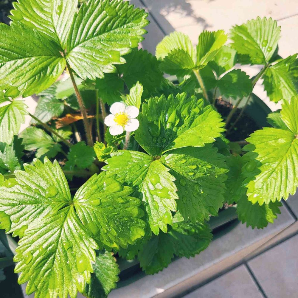 去年育てたワイルドストロベリーの🍓実を庭に投げておいたら出た🌱に、花が付きました~!!!