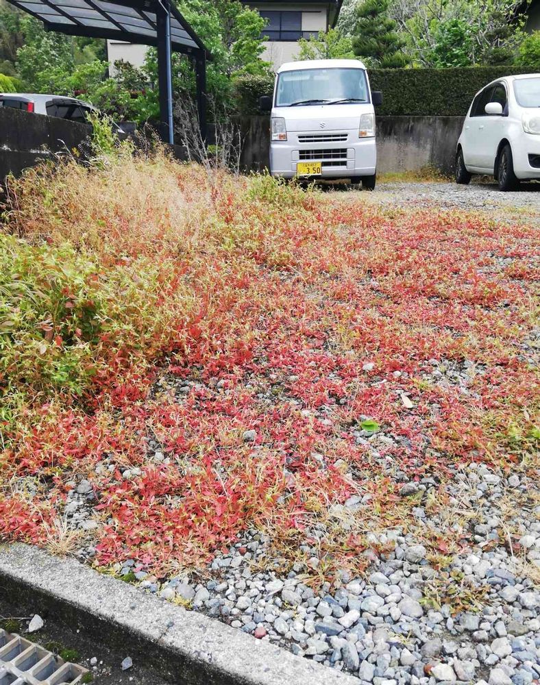 ついでに、と言ったらこの花に怒られますが、何の花でしょうか、向かいの駐車場の縁が真っ赤に紅葉?して来ました。